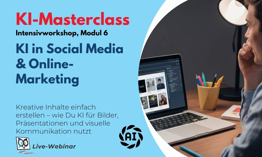 In diesem Modul tauchst du tief in die Welt von Social Media und Online-Marketing mit KI ein. Du lernst, wie du moderne KI-Tools für Content-Erstellung, Zielgruppenansprache, Werbeanzeigen (Ads), SEO, E-Mail-Marketing und E-Commerce nutzen kannst. Der Fokus liegt dabei auf praxisnahen Anwendungen, die dir helfen, deine Marketing-Aktivitäten effizienter, kreativer und datenbasierter zu gestalten. Egal, ob du Social Media Posts planst, Ads für deine Region schaltest oder deine SEO-Strategie optimierst – du erfährst, wie KI dir Zeit spart und gleichzeitig bessere Ergebnisse liefert.